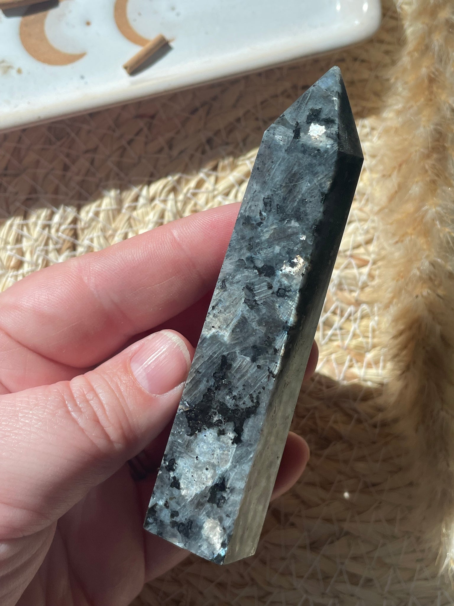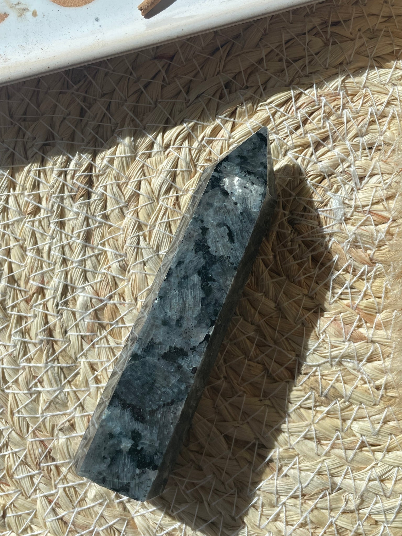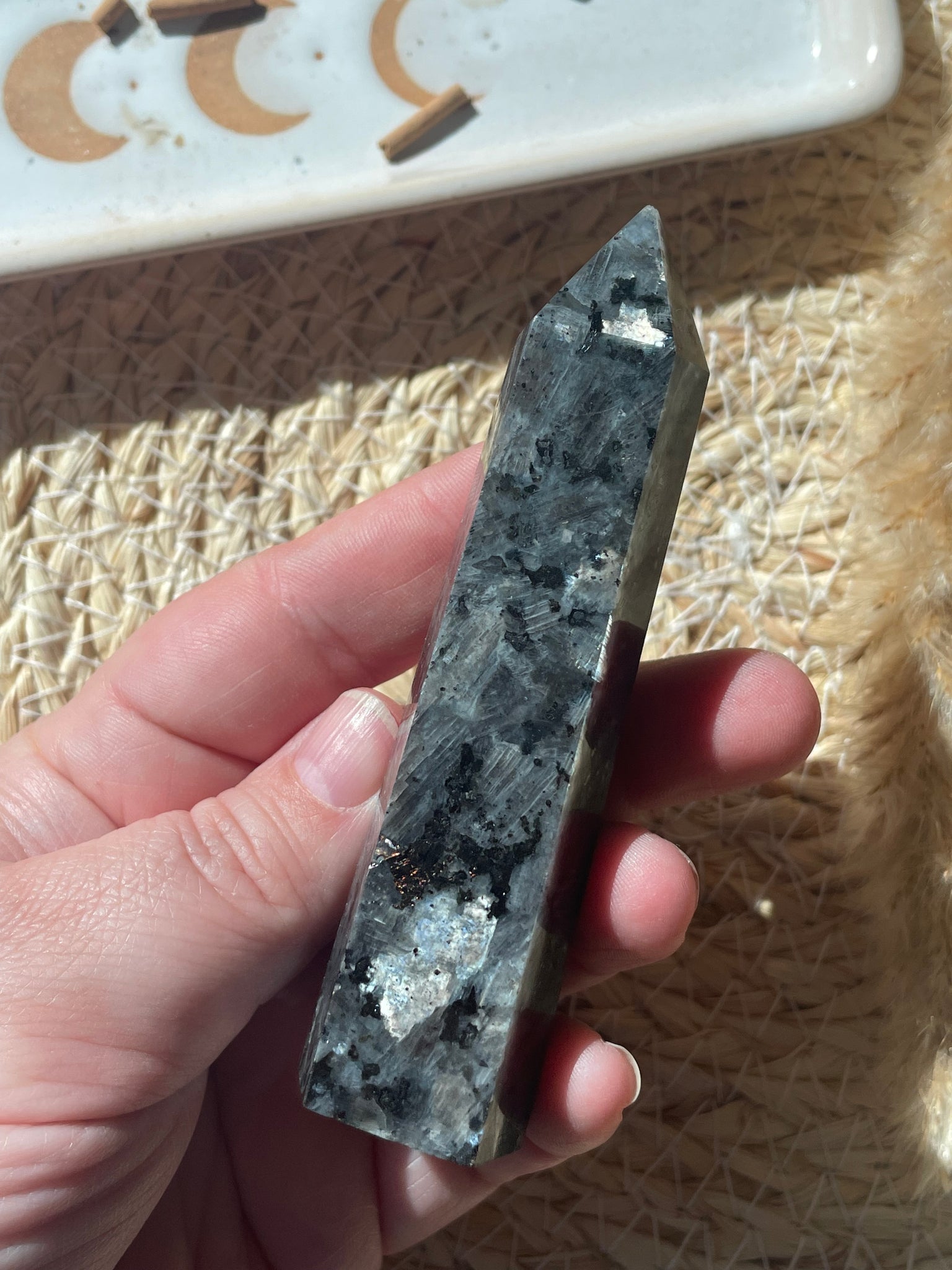 Unearth the beauty and power of Norway's Larvakite stone with our hand-carved crystal tower.