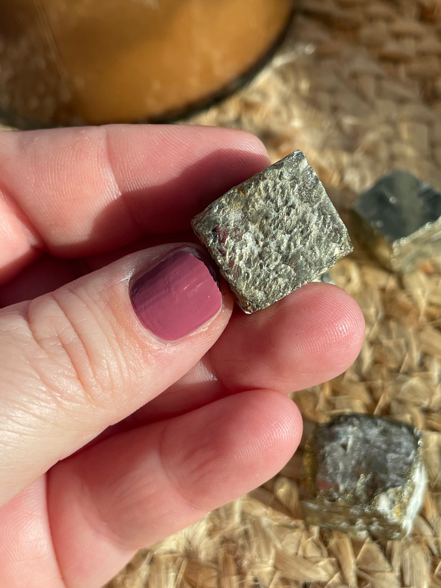 These cute cubes are composed entirely of pyrite, exhibits a metallic luster and distinctive cubic form. This mineral, also known as "fool's gold," contains iron disulfide (FeS2) and is often utilized in geological studies for its crystallography. It can enhance aesthetic appeal in decorative applications while serving educational purposes in mineralogy.