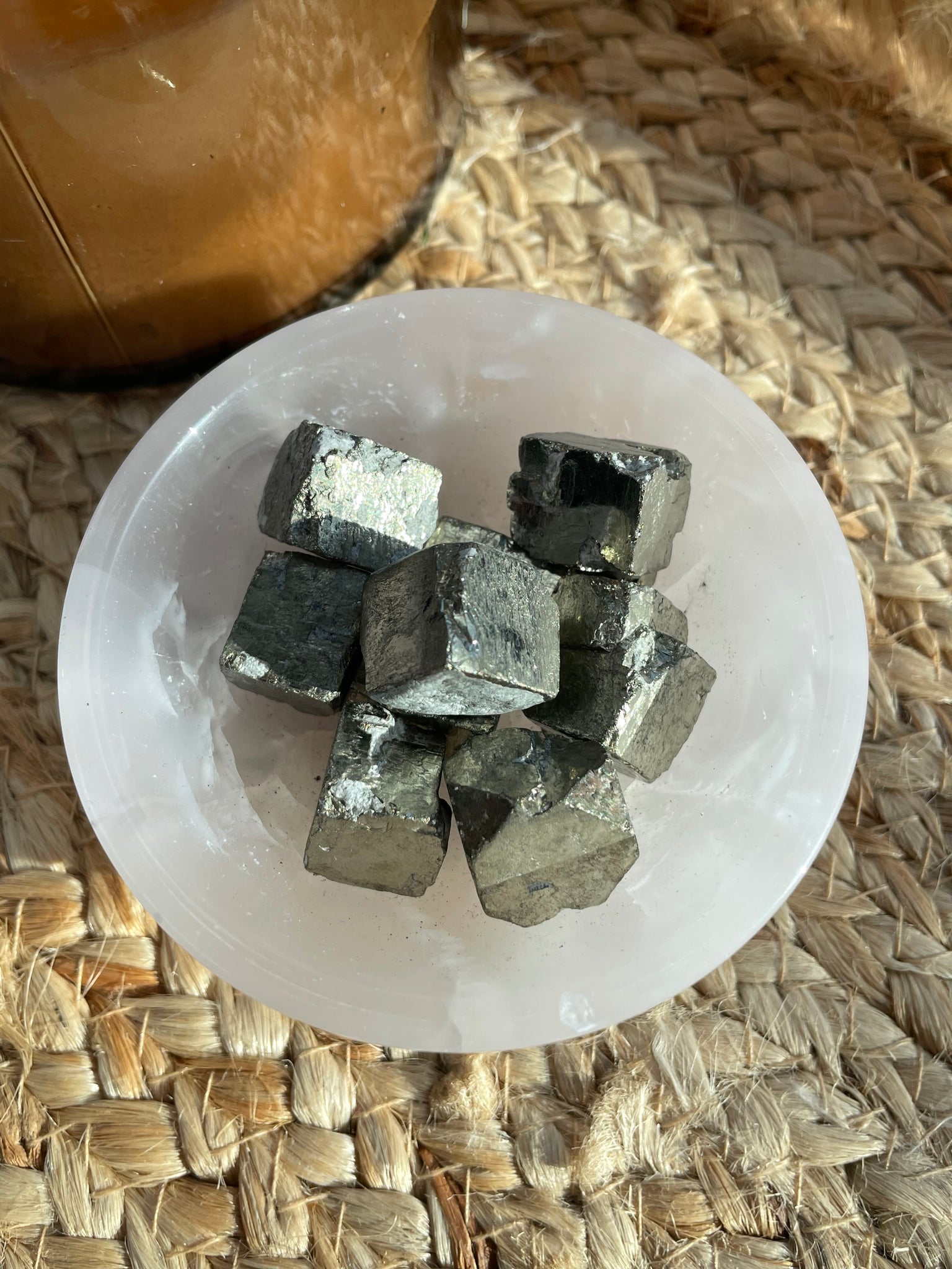 These cute cubes are composed entirely of pyrite, exhibits a metallic luster and distinctive cubic form. This mineral, also known as "fool's gold," contains iron disulfide (FeS2) and is often utilized in geological studies for its crystallography. It can enhance aesthetic appeal in decorative applications while serving educational purposes in mineralogy.