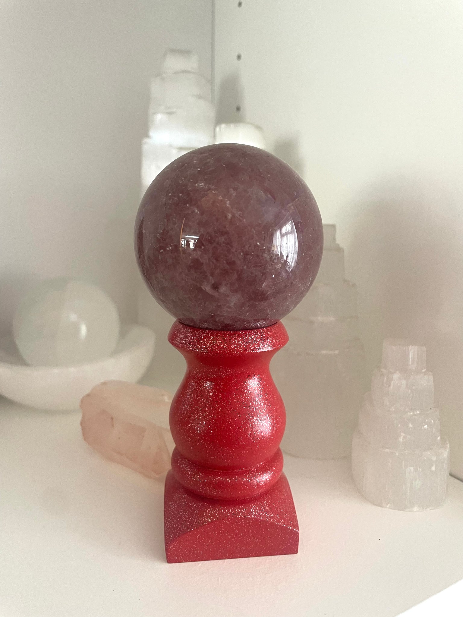 Hand carved wooden sphere stand painted in a unique shade of red with silver glitter.